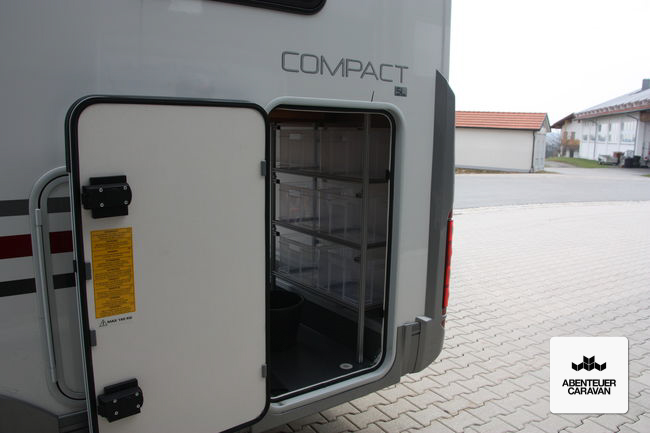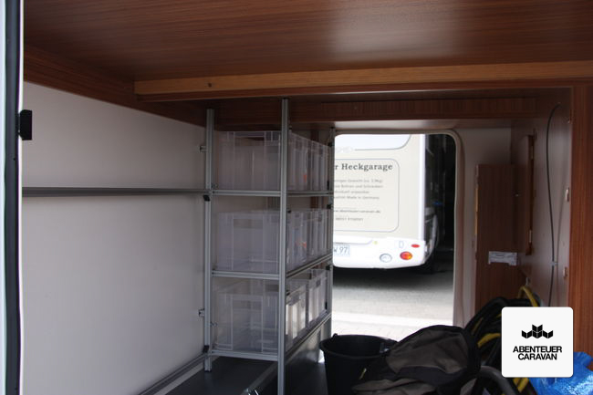 Sonderanfertigung angepasst an die vom Kunden mitgebrachten durchsichtigen Boxen, basierend auf einem L80 Regal mit Campingmöblelhalter