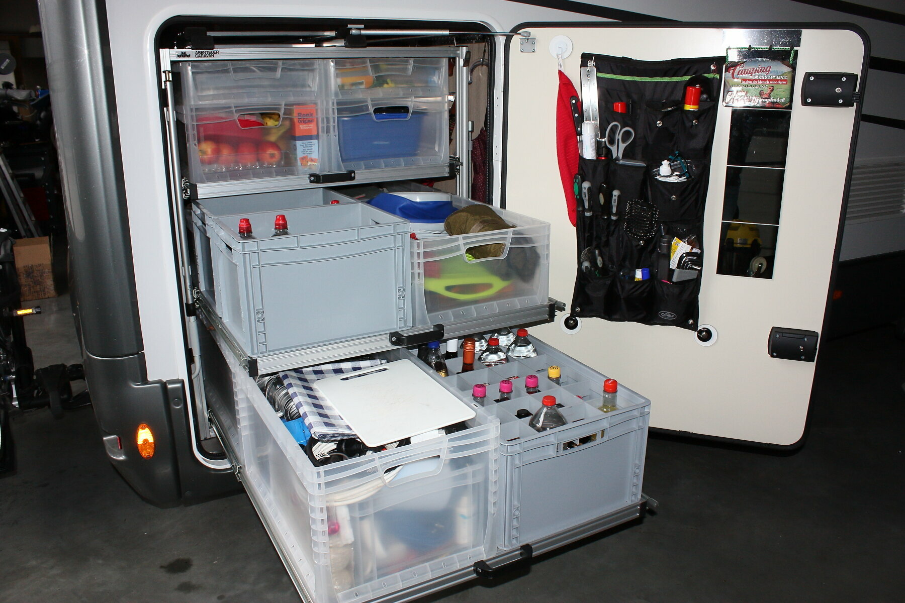 Ich bin vollkommen begeistert, was die beiden in unserer Heckgarage gezaubert haben! Es lohnt sich auf jeden Fall das Ordnungssystem vor Ort montieren zu lassen. Zum einen, weil es die Möglichkeit gibt dort entspannt zu stehen (Strom, Entsorgung vorhanden) und zum Anderen, weil wir nie auf die vielen Kleinigkeiten gekommen wären, die unsere Heckgarage jetzt so perfekt nutzbar machen. Jetzt haben wir tatsächlich ein komplett auf unsere Bedürfnisse angepasstes Ordnungssystem. wirklich toll und sehr empfehlenswert!